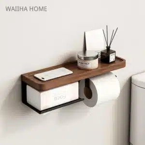 Toilet Paper Holder with Black Walnut Shelf for Bathroom Wall Mounted Toilet Paper Tissue Holder Double Roll Black Phone Rack
