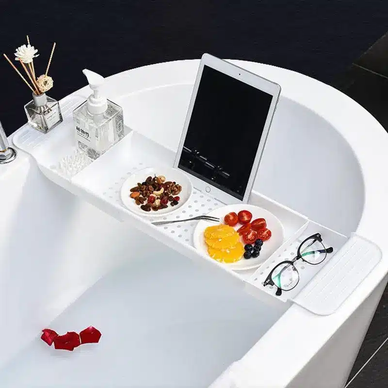 - This bathtub shelf serves as a perfect organiser, offering ample space for various bath items such as children’s toys, sponges, shampoos, conditioners, body wash, and towels, ensuring a clutter-free bathroom.