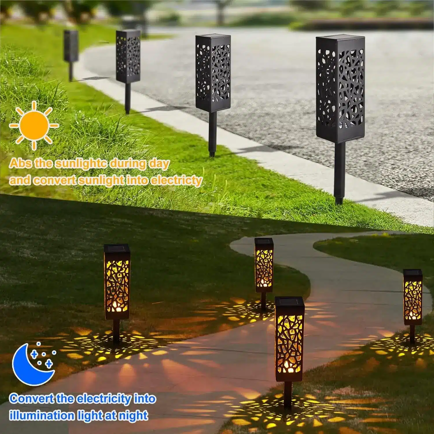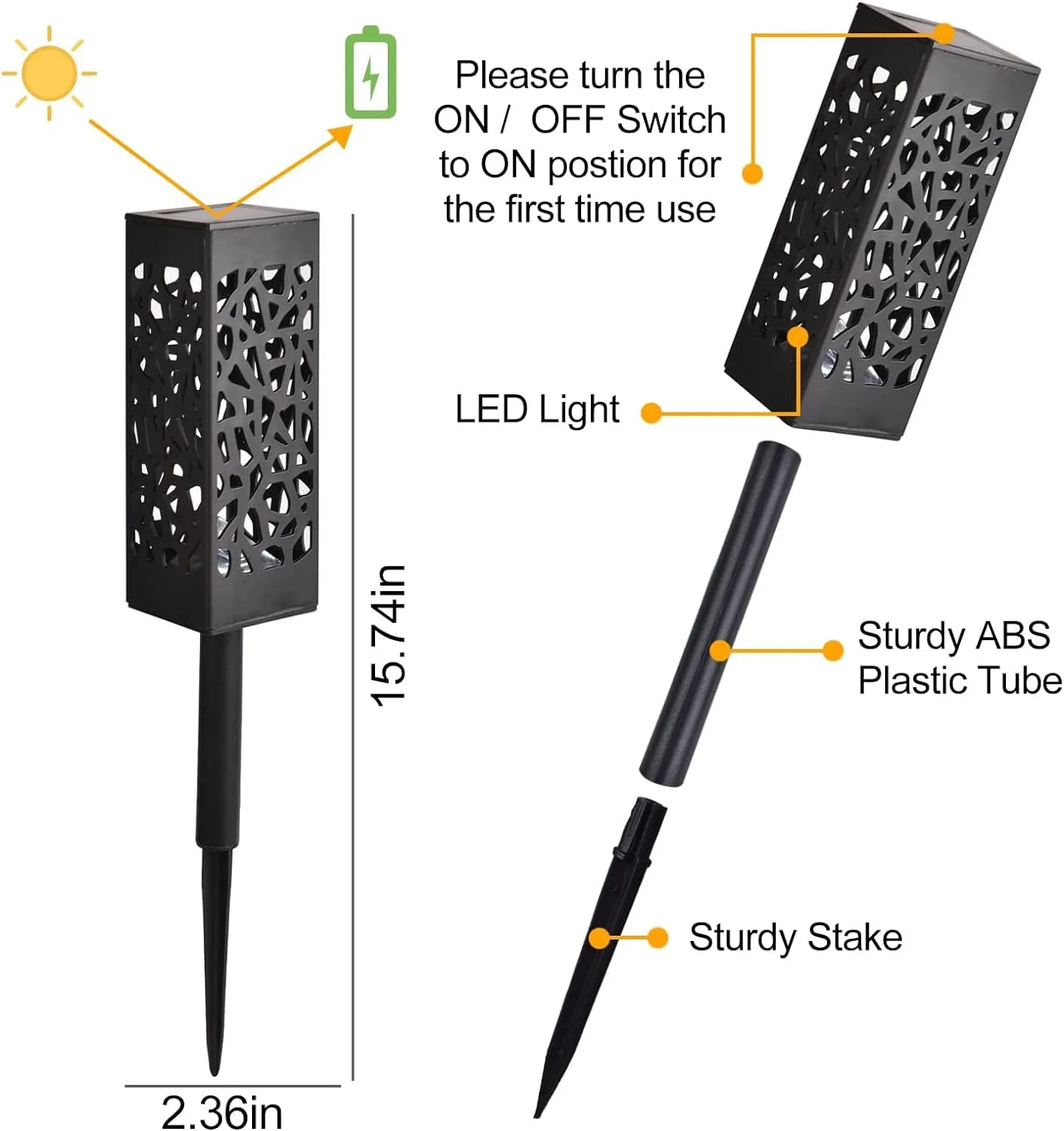 - These solar lights are weather-sensitive, so the working time may vary depending on conditions.